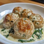 Juicy baked chicken ricotta meatballs meet a silky spinach Alfredo for a cozy, crowd-pleasing dinner. The oven does the searing, the sauce brings the creaminess, and everything comes together in under an hour. Toss with pasta or serve over veggies extra Parmesan on top makes it unforgettable. Leftovers reheat like a dream.