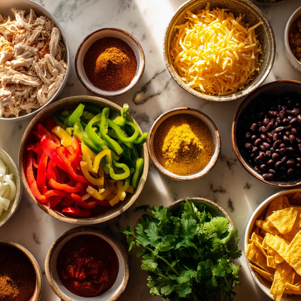 - In a large mixing bowl, combine the shredded chicken, sliced bell peppers, sliced onion, black beans, corn, salsa, chili powder, cumin, garlic powder, and onion powder.