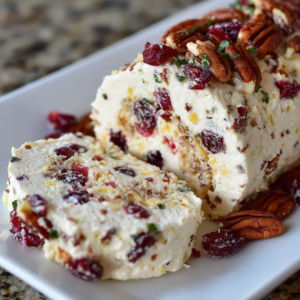 Keywords: cranberry cheese log, festive cheese log, holiday appetizer, cranberry pecan appetizer, cheese ball