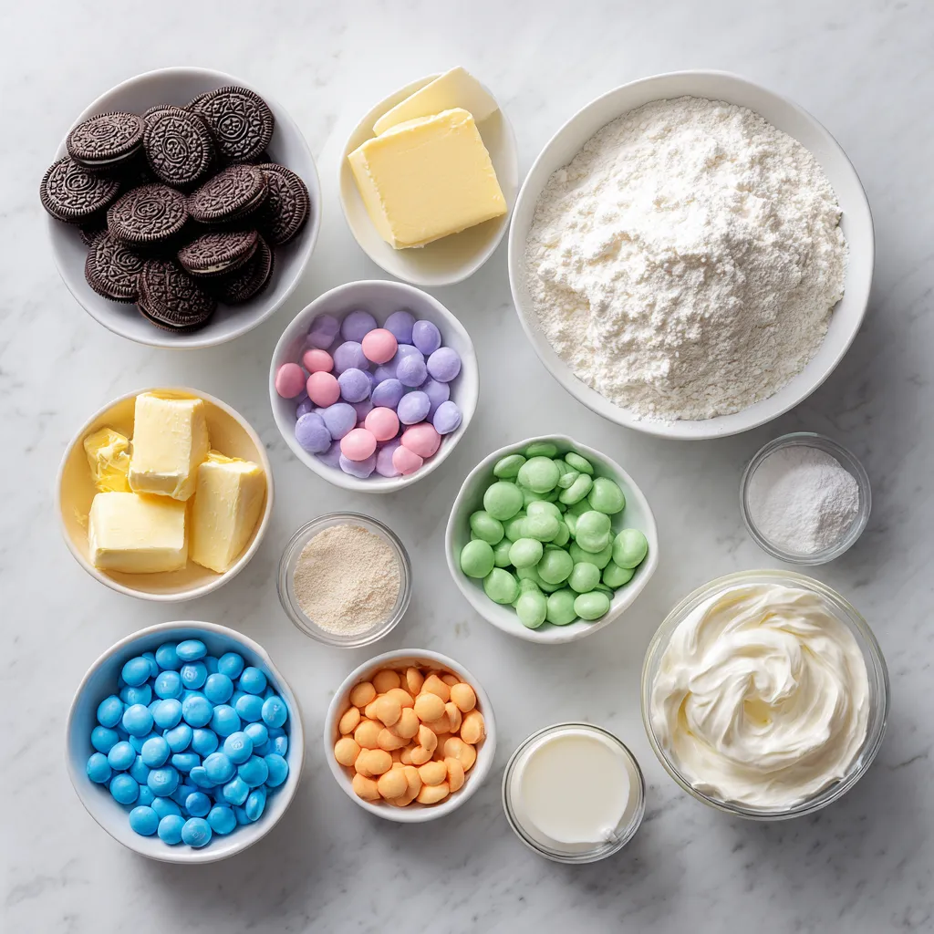 Top with pastel candy-coated chocolates and mini Oreo cookies for a festive Easter-themed finish. - Chill