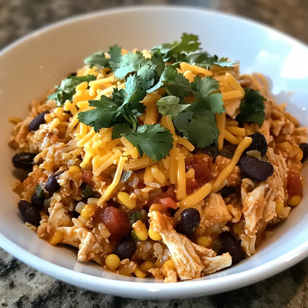 - In a large mixing bowl, combine the shredded chicken, black beans, corn, diced tomatoes with green chilies, cooked rice, salsa, cumin, and chili powder.