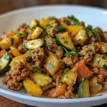 This Ground Turkey Zucchini Skillet is a fast, flavorful way to get a balanced dinner on the table with minimal fuss. Lean turkey, fresh vegetables, and simple seasonings come together in one pan for a protein-rich, low-carb meal that’s just as perfect for busy weeknights as it is for meal prep and leftovers.