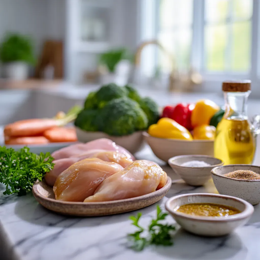 - Bake 25–30 minutes, until chicken reaches 165°F (75°C) and vegetables are tender and lightly caramelized.