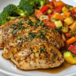 - Bake 25–30 minutes, until chicken reaches 165°F (75°C) and vegetables are tender and lightly caramelized.