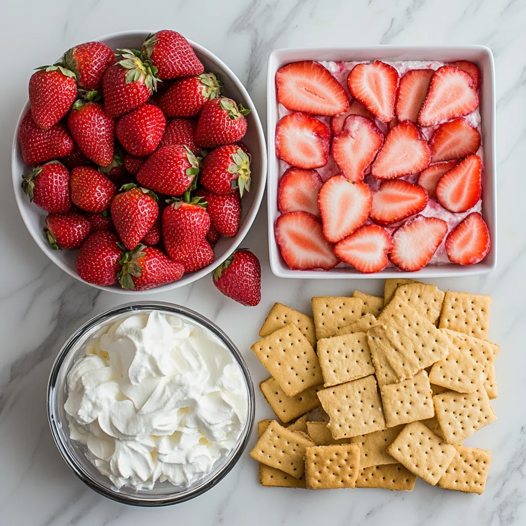 9. Repeat the layers (graham crackers → cream → strawberries) until all ingredients are used, finishing with a layer of cream on top. - Chill: