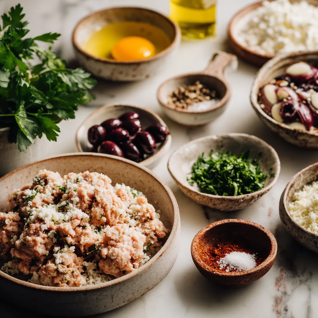 - In a large mixing bowl, combine the ground chicken, breadcrumbs, crumbled feta, chopped Kalamata olives, parsley, minced garlic, dried oregano, paprika, salt, pepper, and beaten egg.