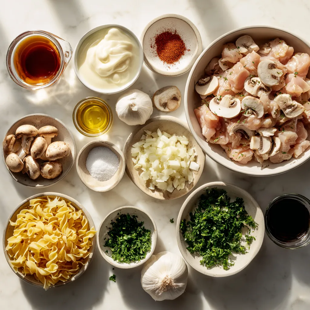 Keywords: one-pot stroganoff, chicken and mushroom, egg noodles, weeknight dinner, creamy pasta, quick comfort food, 30-minute meal