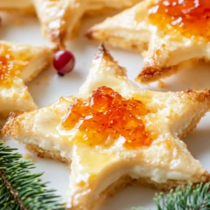 A festive and flavorful treat, these cheese-filled puff pastry stars topped with red hot pepper jelly are the perfect combination of creamy, spicy, and crispy. Whether you’re hosting a holiday party or a casual get-together, these eye-catching bites are guaranteed crowd-pleasers!