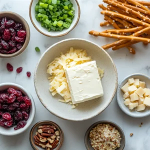 - In a mixing bowl, combine the softened cream cheese, shredded cheddar cheese, chopped dried cranberries, green onions, honey, garlic powder, onion powder, salt, and pepper. Mix until well combined and smooth.